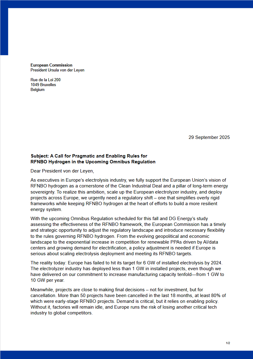 This letter outlines our shared proposals to unlock investment, accelerate project deployment, and ensure Europe’s hydrogen leadership. It is sent in a spirit of constructive collaboration with the European Commission at this pivotal moment.