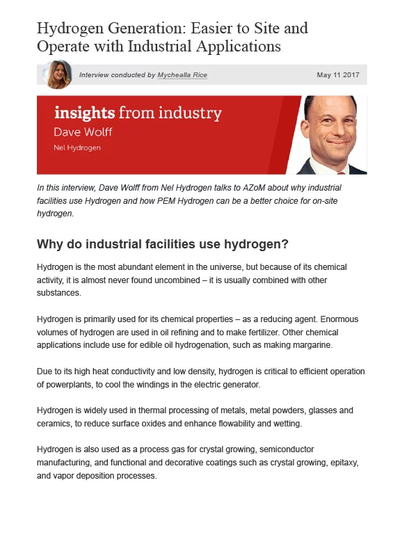 In this interview, Dave Wolff from Nel Hydrogen talks to AZoM about why industrial facilities use Hydrogen and how PEM Hydrogen can be a better choice for on-site hydrogen.